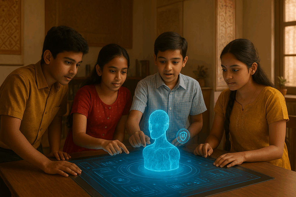 A vibrant 4K Ultra HD image showing a diverse group of Indian students—children and young adults—enthusiastically learning artificial intelligence in a modern classroom. The setup includes laptops, IoT devices, development boards, and sensors, blended with traditional Indian cultural elements like colorful attire and wall art. Bright natural lighting highlights collaboration, innovation, and hands-on AI learning.
