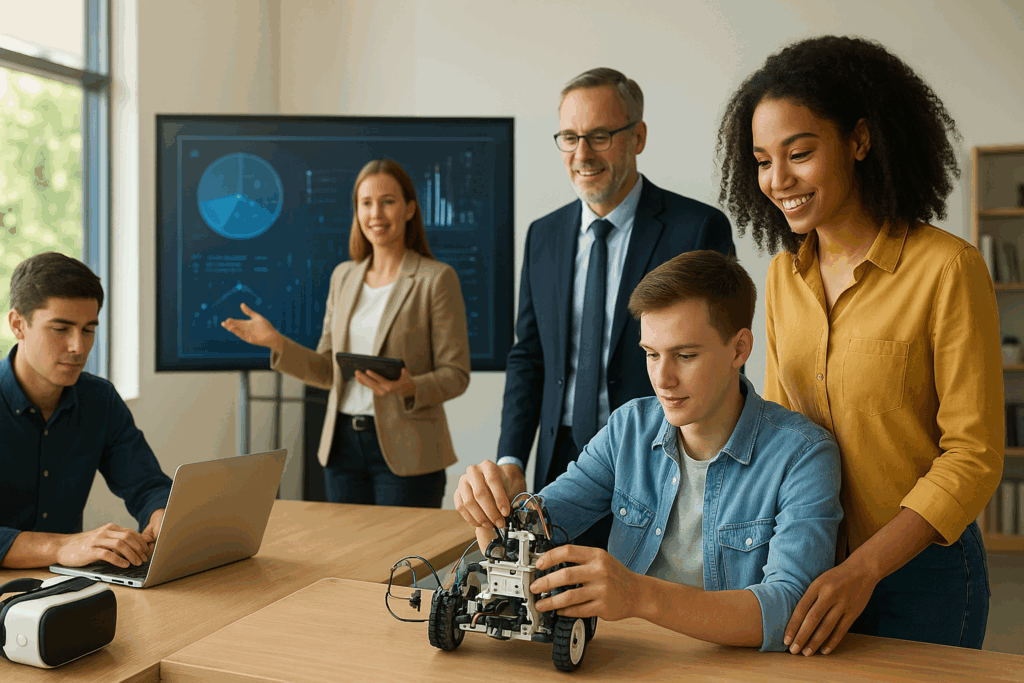 Students learning Artificial Intelligence online course in 2025 with holographic displays of AI brains, humanoid robots, and robotics technology.